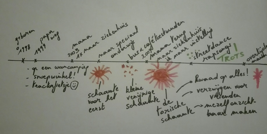 Sabine Vermeire: “Vanuit de veilige grond die we bereiken met het biografische interview, en de opgediepte pareltjes die opnieuw “a sense of agency” en “belonging” bevorderen, kunnen we een volgende stap zetten in ons gezamenlijk onderzoek met de jongere. Hun intieme relaties zijn vaak beschadigde terreinen en het thema ‘liefde’ heeft een wrange, pijnlijke smaak gekregen vandaar dat we hen uitnodigen om over liefde te spreken en te reflecteren in de hoop terug rijkere verhalen te (her)ontdekken. ‘Wat betekent liefde voor jou, welke soorten liefde ken je, wat is voor jou echte liefde, welke soorten relaties ken je, bij wie en waar heb je van welk soort liefde geproefd die je wil vasthouden?’, waren enkele van de vragen die we hen voorlegden. Stap voor stap exploreerden en brachten we de verschillende ervaringen die ze gekend hebben, in kaart.