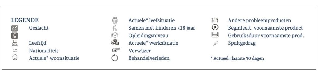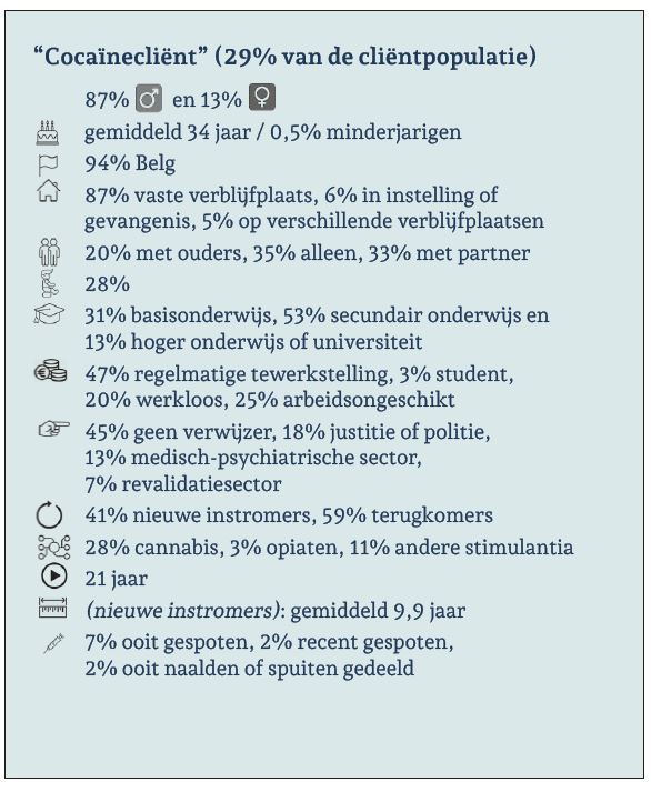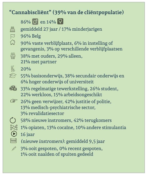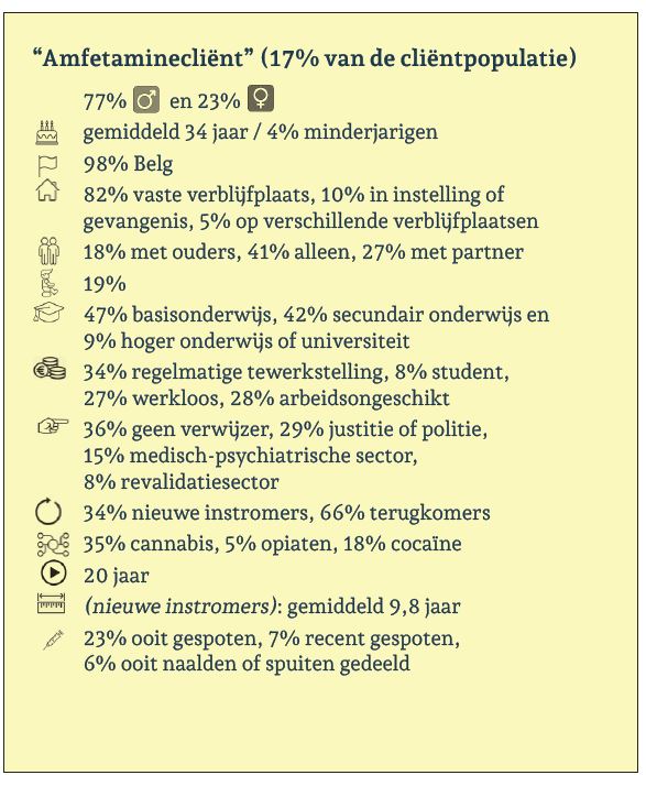 Binnen élke productgroep is er een ruime meerderheid aan mannen, maar binnen de amfetaminegroep is het aandeel vrouwen het hoogst. De gemiddelde leeftijd en het aandeel minderjarigen lopen sterk uiteen naargelang het voornaamste product: de gemiddelde cannabiscliënt (27 jaar) is 11 jaar jonger dan de opiaatcliënt (38 jaar). Cocaïne- en amfetaminecliënten bevinden zich tussen beide uitersten in met gemiddeld 34 jaar. De meeste cliënten hebben de Belgische nationaliteit ongeacht het voornaamste product.