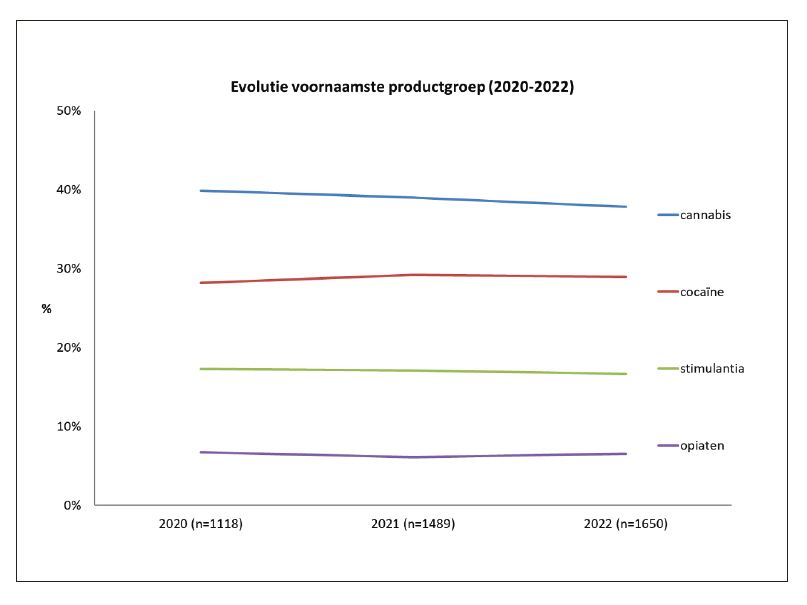 In de periode 2020-2022 is cannabis (marihuana en hasj) met gemiddeld 39% dé absolute koploper binnen de populatie van De Sleutel, al is het aandeel cannabis-gerelateerde hulpvragen in deze periode licht gedaald. Na jaren van blijvende groei is de productgroep van cocaïne (inclusief crack) sinds 2020 gestabiliseerd rond 29%. De derde voornaamste groep wordt gevormd door de groep van andere stimulantia (i.e. (meth)amfetamine, MDMA, mefedrone). Ook het aandeel van deze productgroep binnen de populatie van De Sleutel is sinds 2020 stabiel en ligt op 17%. Tot slot is er de productgroep van opiaten (voornamelijk heroïne, maar ook substitutiemiddelen) die na jaren van aanhoudende daling blijft hangen rond 6%.