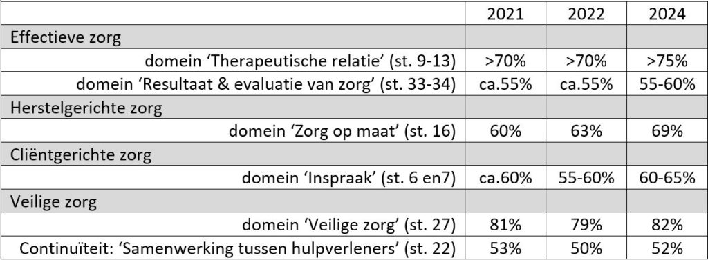 Doorheen de laatste 3 bevragingen stellen we een duidelijk positieve trend vast voor 3 kwaliteitsstandaarden: effectieve, herstelgerichte en cliëntgerichte zorg. De score voor de kwaliteitsstandaard ‘veilige zorg’ blijft status-quo op een hoog niveau, terwijl het aspect van zorgcontinuïteit eveneens status-quo blijft maar duidelijk voor verbetering vatbaar is.