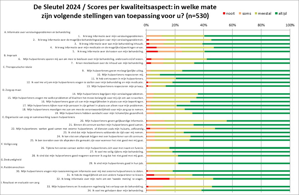 Behalve deze globale score komen in de vragenlijst 34 concrete items aan bod die opgedeeld worden in 9 domeinen of kwaliteitsaspecten. De gedetailleerde scores van 2024 vind je in onderstaande grafiek, waarbij de groen ingekleurde balken verwijzen naar de positieve scores met name het aandeel antwoorden ‘meestal’ en ‘altijd’.