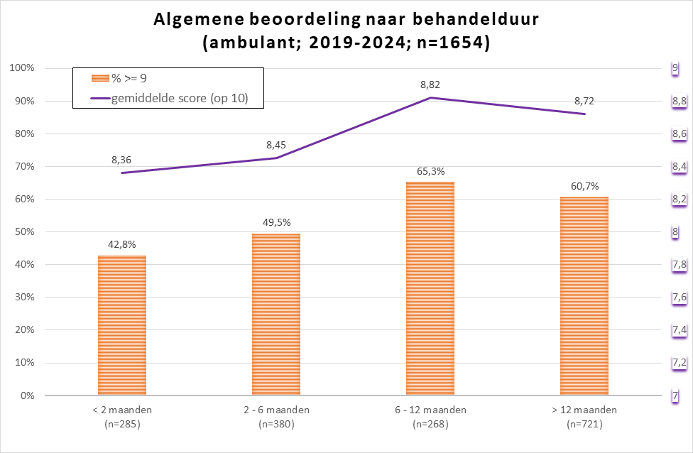 De grafiek illustreert dat er een positieve samenhang bestaat tussen de behandelduur en de tevredenheidsscore. Respondenten die op het ogenblik van de bevraging minder dan 2 maanden in ambulante behandeling zijn, geven gemiddeld 8,4 op 10 als algemene score. Cliënten die reeds meer dan 6 maanden in behandeling zijn, geven met 8,8 op 10 een significant hogere score. Ook het aantal topscores (9 of 10) ligt veel hoger bij de respondenten met een behandelduur van meer dan 6 maanden.